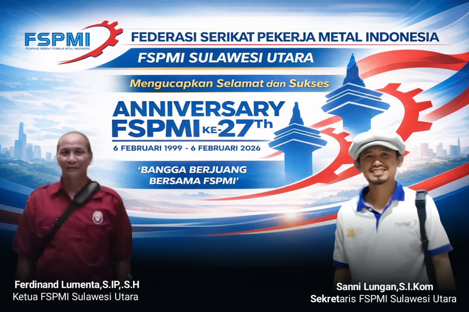 Sulawesi Utara, TelusurInformasiNews.id – Federasi Serikat Pekerja Metal Indonesia (FSPMI) memasuki usia ke-27 tahun dengan semangat perjuangan yang tak pernah padam. Selama hampir tiga dekade, FSPMI berdiri tegak sebagai organisasi perjuangan kelas pekerja yang konsisten melawan penindasan, ketidakadilan, dan kebijakan yang merugikan buruh.