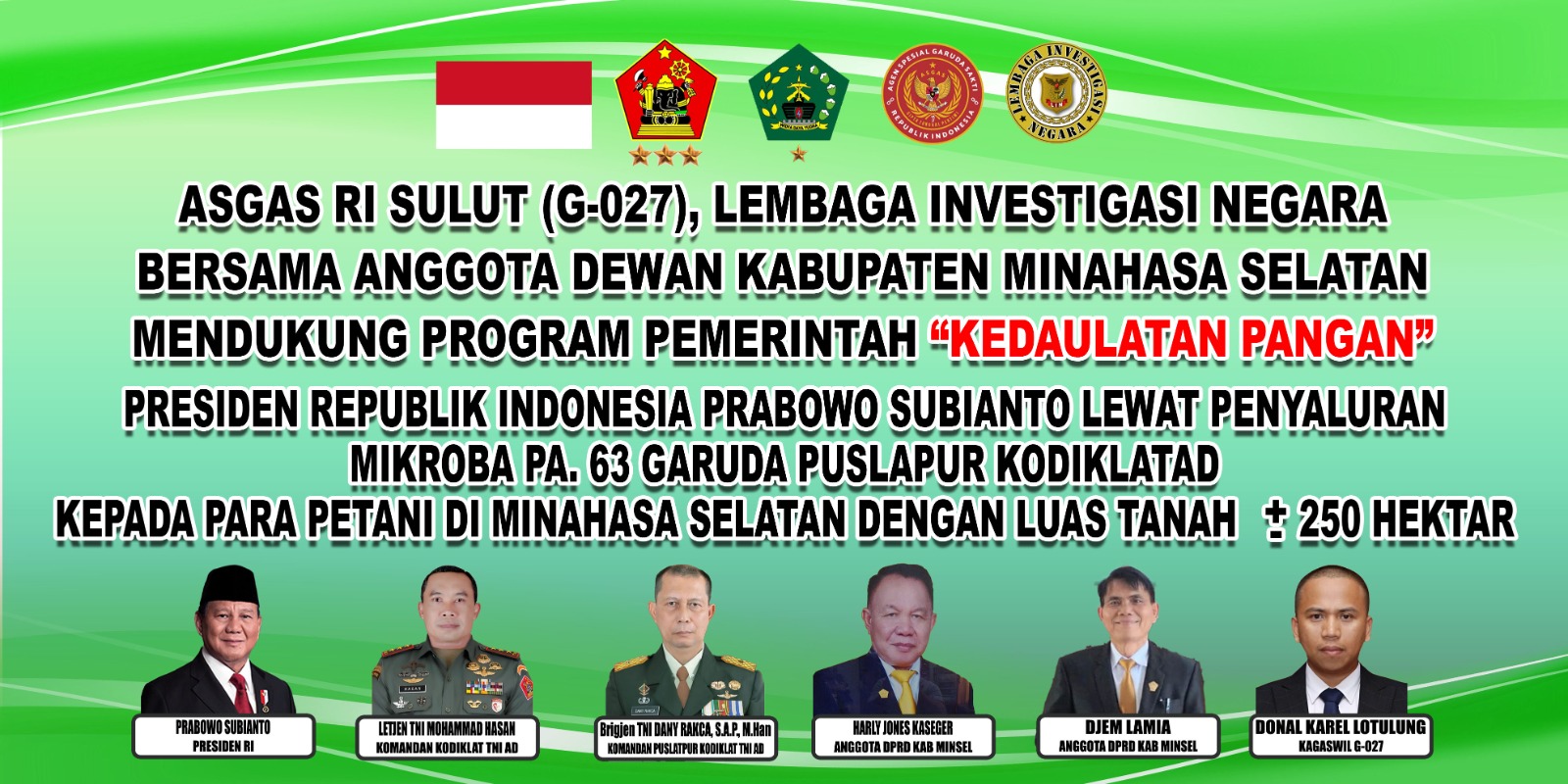 MINUT, Telusurinformasinews.id – ASGAS RI SULUT (G-027), Lembaga Investigasi Negara, bersama anggota Dewan Kabupaten Minahasa Selatan, mendukung program pemerintah kedaulatan pangan Presiden Republik Indonesia Prabowo Subianto. Mereka melakukan penyaluran mikroba PA, 63 Garuda Puslapur Kodiklatad kepada para petani di Minahasa Selatan dengan luas tanah 250 hektar, kepada petani yang ada diwilayah desa Tumpaan Amurang Kabupaten Minahasa. Selasa, (8/4/2025).