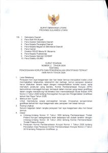Imbauan tersebut disampaikan melalui Surat Edaran Bupati Minahasa Utara, Joune Ganda, bernomor 2 Tahun 2026 tentang Pencegahan Korupsi dan Pengendalian Gratifikasi Terkait Hari Raya Tahun 2026. Surat yang diterbitkan pada 9 Maret 2026 itu ditujukan kepada seluruh pimpinan perangkat daerah, camat, hingga pimpinan Badan Usaha Milik Daerah (BUMD), guna memastikan kepatuhan jajaran pemerintah setempat.