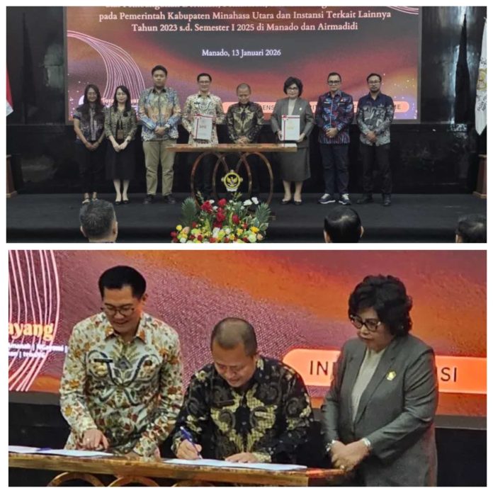 MINUT, TelusurInformasiNews.id.-Memasuki tahun 2026, Pemerintah Kabupaten Minahasa Utara menampilkan keseriusan dalam meningkatkan transparansi dan mutu pelayanan publik. Pada Senin (13/1), di Aula Kantor BPK RI Perwakilan Sulawesi Utara, Bupati Minahasa Utara, Joune Ganda, secara resmi menerima Laporan Hasil Pemeriksaan (LHP) Kinerja Tahun 2025 yang menjadi panduan pembangunan daerah selama setahun ke depan. Selasa, (13/1/2026).