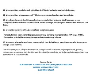 FSPMI Sulawesi Utara bersama aliansi serikat pekerja dan koalisi masyarakat sipil menyatakan tetap membuka ruang dialog. Namun apabila tuntutan yang telah disampaikan tidak segera mendapatkan solusi konkret dan kepastian penanganan, maka tidak menutup kemungkinan aksi di lapangan akan kembali dilakukan sebagai bentuk perjuangan lanjutan untuk memperoleh keadilan, kepastian hukum, dan perlindungan yang layak bagi pekerja.