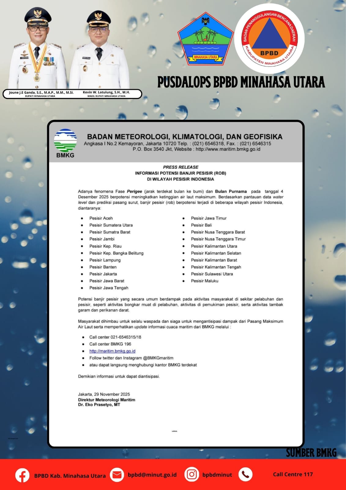 MINUT, TelusurInformasiNews.id.- Pusat Pengendalian Operasi (Pusdalops) BPBD Minahasa Utara secara resmi mengumumkan peringatan dini kepada masyarakat yang tinggal di wilayah pesisir seiring dengan informasi terbaru dari Badan Meteorologi, Klimatologi, dan Geofisika (BMKG) memberikan informasi penting mengenai potensi terjadinya banjir pesisir atau rob yang dipengaruhi oleh fenomena astronomis.