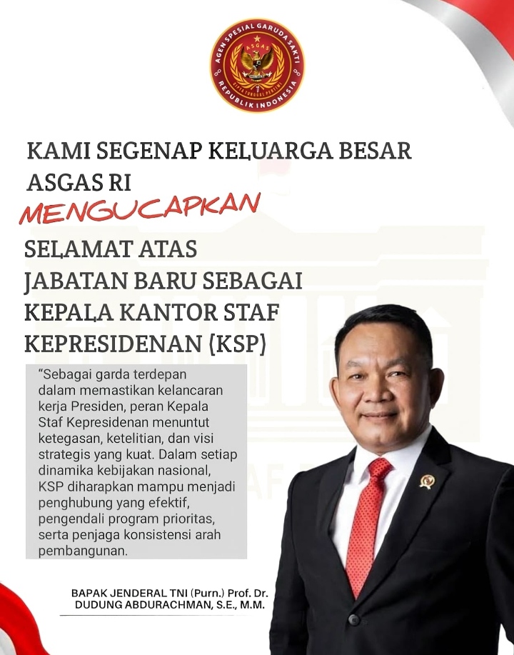 “Atas nama seluruh keluarga besar ASGAS RI, kami mengucapkan selamat dan sukses kepada Bapak Jenderal TNI (Purn.) Prof. Dr. H. Dudung Abdurachman, S.E., M.M., atas dilantiknya sebagai Kepala Staf Kepresidenan oleh Bapak Presiden Prabowo Subianto,” ujar Sekretaris Jenderal ASGAS RI, Tengku Ali Husain, dalam keterangannya, Senin (27/4).