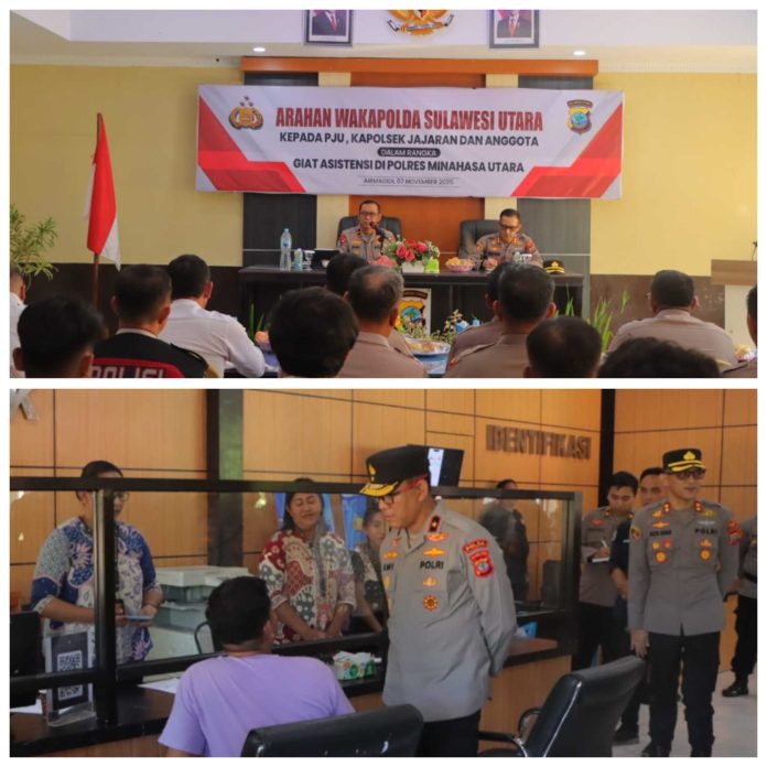MINUT, TelusurInformasiNews.id.- Wakil Kepala Kepolisian Daerah (Wakapolda) Sulawesi Utara, Brigjen Pol Awi Setiyono S.I.K., M.Hum, melakukan kunjungan kerja ke Polres Minahasa Utara (Minut). Kegiatan yang bertujuan untuk memberikan asistensi ini dihadiri pula oleh Tim Asistensi yang terdiri dari AKBP Hansjen Ratag, AKBP Dwi Yatmoko, dan Kompol Deki R. Pangandaheng. Jumat, (7/11/2025).