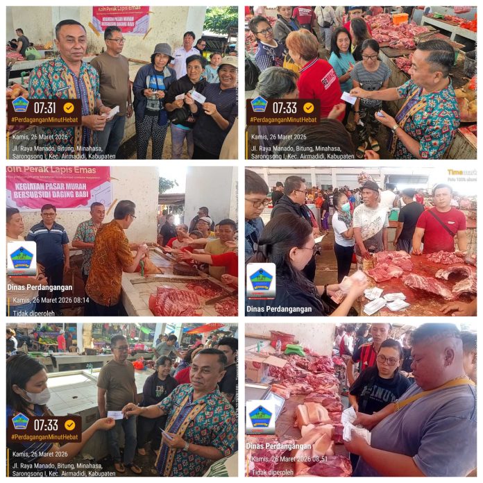 MINUT, TelusurInformasiNews.id -Pemerintah Kabupaten Minahasa Utara, melalui dinas Perdagangan kembali menghadirkan program pasar murah bersubsidi, kali ini dengan fokus pada komoditas daging babi. Kegiatan yang digelar di Pasar Airmadidi ini bertujuan untuk meringankan beban ekonomi masyarakat jelang Paskah sekaligus menjaga stabilitas harga pangan, terutama di masa-masa tertentu. Kehadiran program ini disambut positif oleh warga yang memadati lokasi pasar sejak pagi hari. Kamis, (26/3/2026)