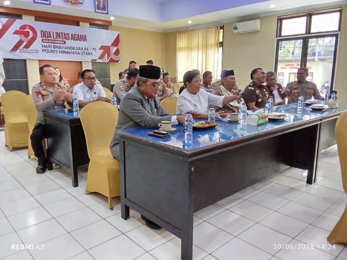 MINUT, TelusurInformasiNews.id -Pemerintah kabupaten Minahasa Utara, Bupati Joune Ganda yang diwakili oleh Assisten satu Pemkab Minut Umbase Mayuntu, S.Sos., M.Si., mengikuti Doa Bersama dalam rangka Peringatan Hari Bhayangkara Ke-79 Tahun 2024 di Aula Polres Minahasa Utara. Senin, (30/6/2025).