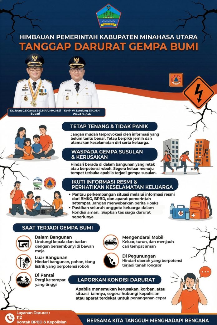 MINUT, TelusurInformasiNews.id – Pemerintah Kabupaten Minahasa Utara mengeluarkan imbauan resmi kepada masyarakat terkait penanganan darurat gempa bumi yang terjadi. Dalam imbauan tersebut, warga diminta untuk tetap tenang, tidak panik, serta selalu mengutamakan keselamatan diri dan keluarga. Selasa, (2/4/2026).