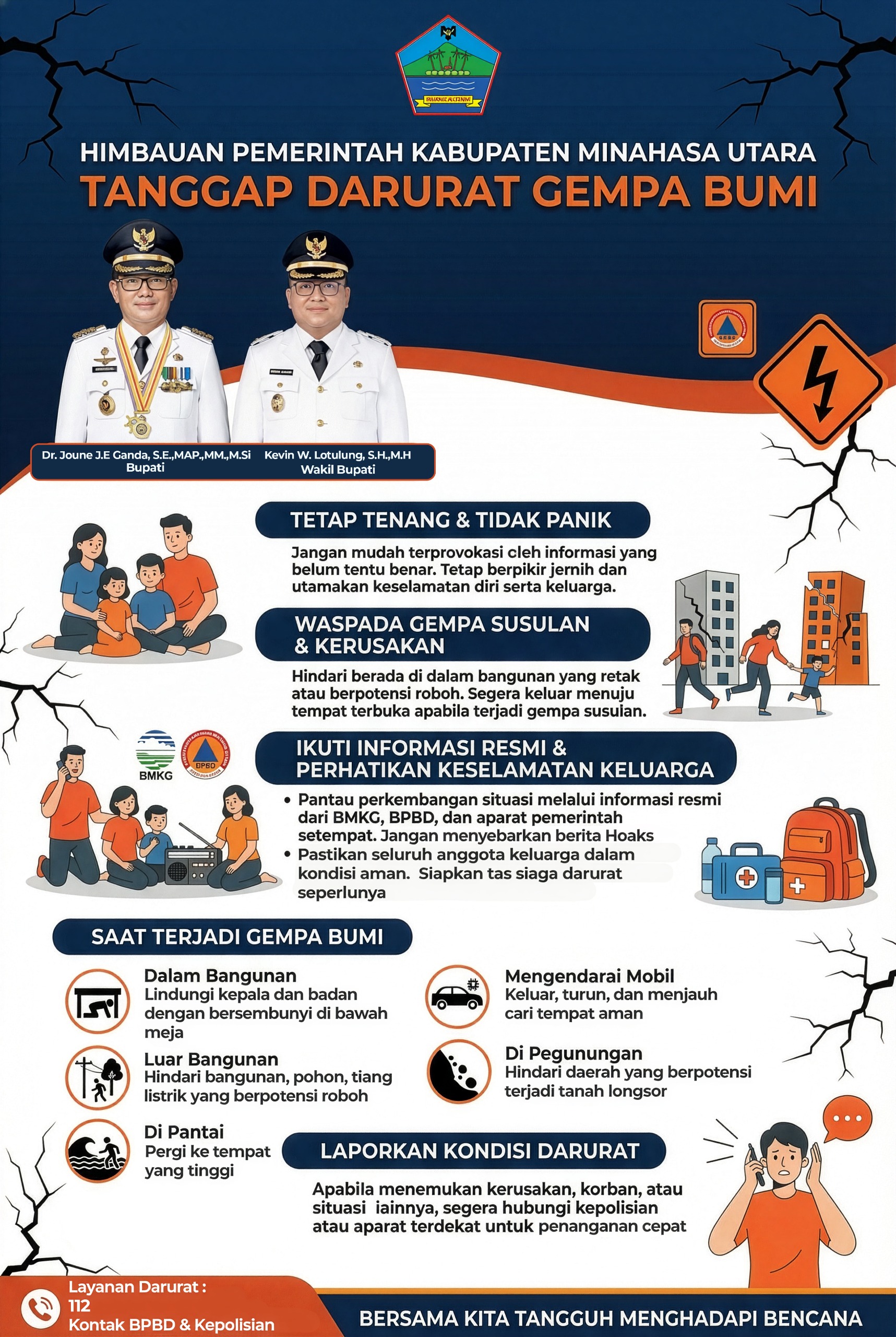 Bupati Minahasa Utara, Dr. Joune J.E. Ganda, S.E., MAP., MM., M.Si, bersama Wakil Bupati Kevin W. Lotulung, S.H., M.H, menegaskan pentingnya kewaspadaan di tengah situasi bencana. Masyarakat diingatkan agar tidak mudah terprovokasi oleh informasi yang belum jelas kebenarannya, serta tetap berpikir jernih dalam menghadapi kondisi darurat.