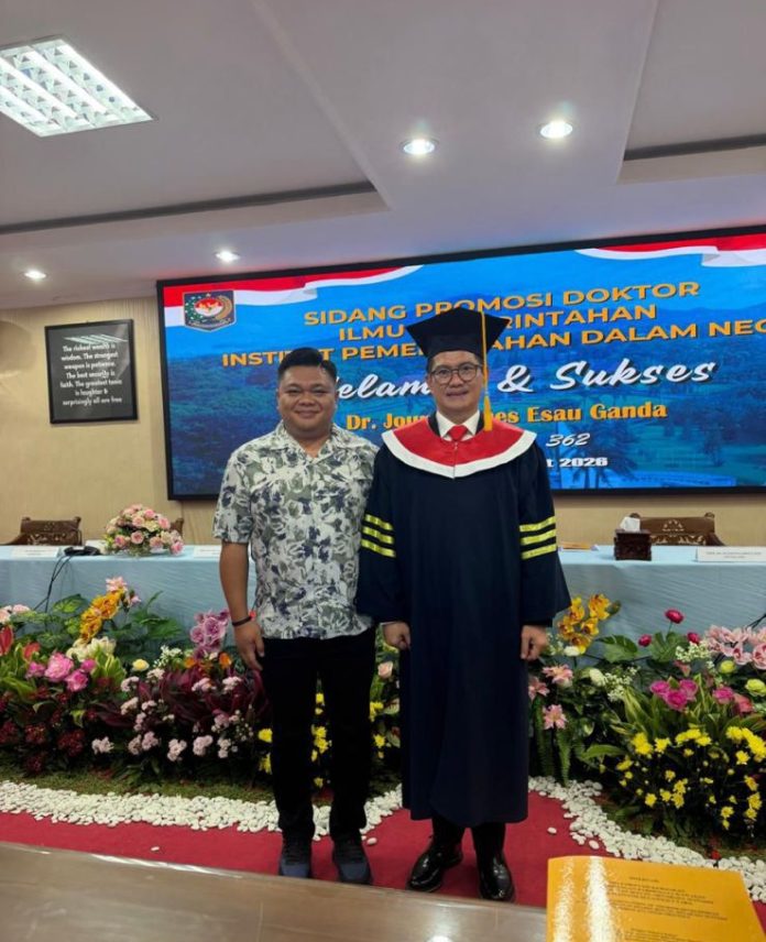 MINUT, TelusurInformasiNews.id.- Ariel Eril Bolung, seorang pengusaha sukses di Kabupaten Minahasa Utara (Minut), turut menyampaikan ucapan selamat dan apresiasi setinggi-tingginya kepada Bupati Joune Ganda. Ucapan ini disampaikan menyusul keberhasilan Bupati Ganda meraih gelar Doktor (S3) dengan predikat Cumlaude dalam ujian terbuka di Institut Pemerintahan Dalam Negeri (IPDN), Jakarta, Rabu (4/3/2026).