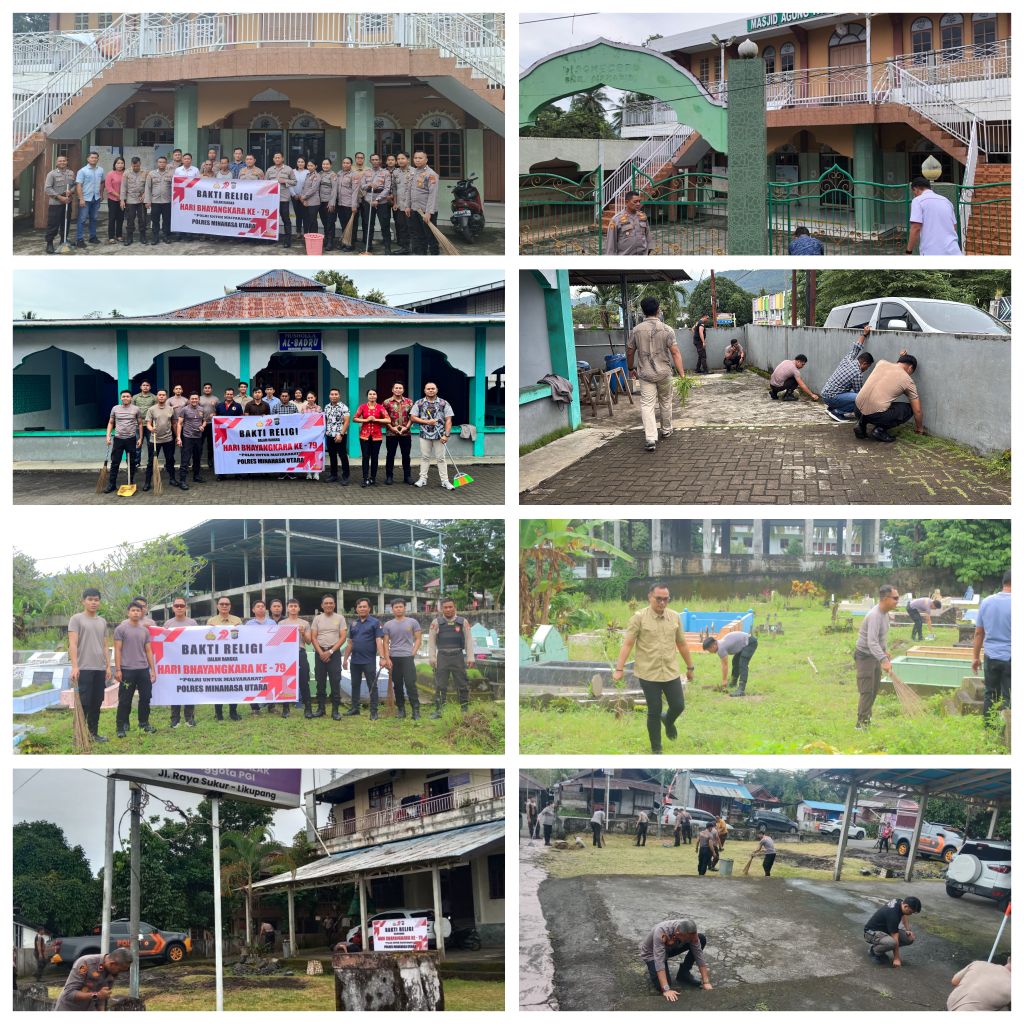 MINUT, TelusurinformasiNews.id – Polres Minahasa Utara menggelar kegiatan Bakti Religi dalam rangka menyambut Hari Bhayangkara ke-79 tahun 2025. Kegiatan ini dilaksanakan di 4 lokasi, yaitu Masjid Diponegoro, Mushola Al-Badru, TPU Airmadidi Bawah, dan Gereja GMIM Immanuel Laikit, Kecamatan Dimembe, Kabupaten Minahasa Utara. Kamis, (19/6/2025)