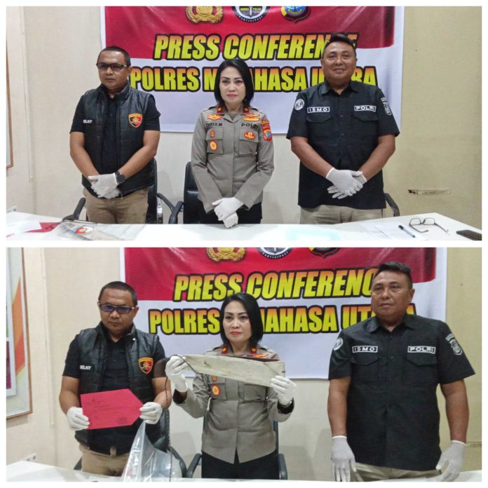 MINUT, TelusurInformasiNews.id – Polres Minahasa Utara (Minut) menggelar konferensi pers untuk memaparkan kasus penganiayaan berat berujung maut di Desa Tontalete. Wakapolres Minut Kompol Thely Mawidingan, SE menyampaikan kronologi lengkap peristiwa yang diduga dipicu dendam pribadi pelaku terhadap korban. Selasa, (31/3/2026).