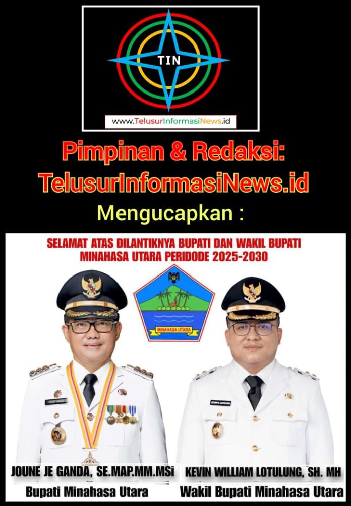 MINUT, TelusurInformasiNews.id – Direksi PT MEDIA TELUSUR MANDIRI bersama Redaksi dan Tim jurnalis Mengucapkan selamat kepada Bupati Joune J. E. Ganda, S.E., M.A.P., M.M., M.Si dan Kevin William Lotulung S.H, M.H. atas dilantiknya sebagai Bupati dan Wakil Bupati Minahasa Utara. Kamis (20/02/2025).