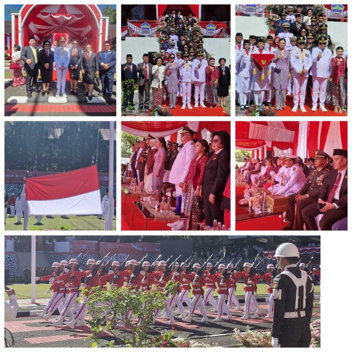 MINUT, TelusurInformasiNews.id. -Peringatan Hari Ulang Tahun Kemerdekaan Republik Indonesia ke-80 di Kabupaten Minahasa Utara berlangsung dengan khidmat. Bupati Joune Ganda dan Wakil Bupati Kevin William Lotulung mengikuti upacara yang dimeriahkan dengan pengibaran bendera Merah Putih oleh 76 anggota Paskibraka. Bupati bertindak sebagai Inspektur Upacara. Minggu, (17/8/2025).